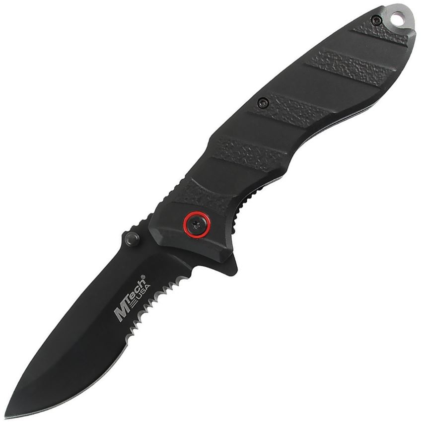 Model/Item/Part Number -MTA2048BK. MTech Knives - Assist Open Black Linerlock Knife Black Aluminum Handles. Assisted opening. 4.75" (12.07cm) closed. 3.25" (8.26cm) black oxide coated partially serrated 3Cr13MoV stainless blade. Black anodized aluminum handle. Extended tang. Thumb stud. Lanyard hole. Pocket clip. Red accents. Boxed. Made in China.