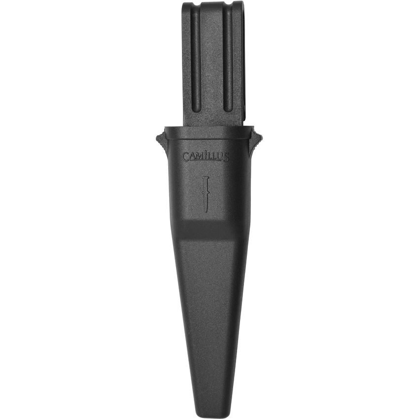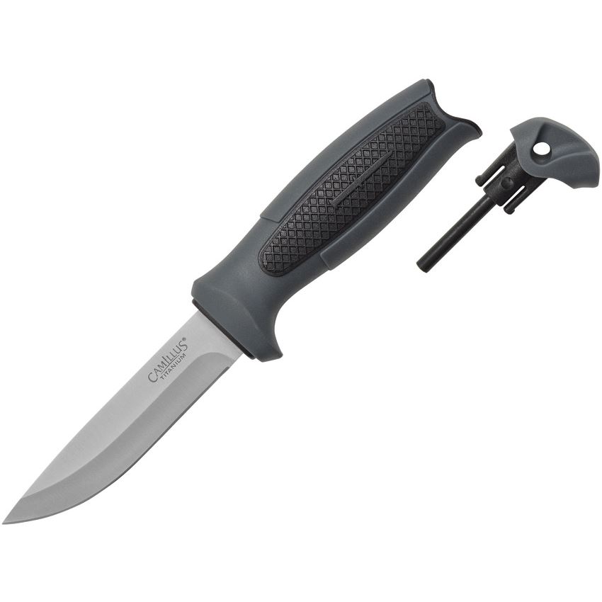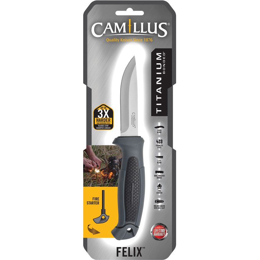 Model/Item/Part Number -CM19619. Camillus Knives - Felix Drop Point Fixed Blade Knife Dark Gray/Black Handles. 8.5" (21.59cm) overall. 3.75" (9.53cm) titanium coated 420 stainless drop point blade. Dark gray and black injection molded handle. Fire starter stores in handle. Black molded plastic belt sheath. Clam packed. Made in China.