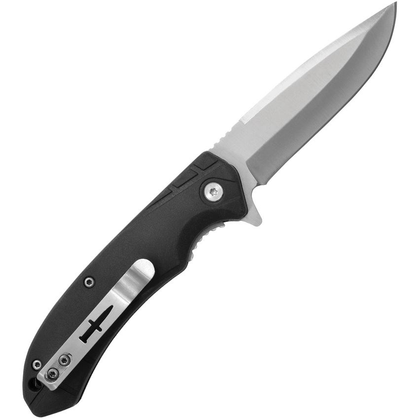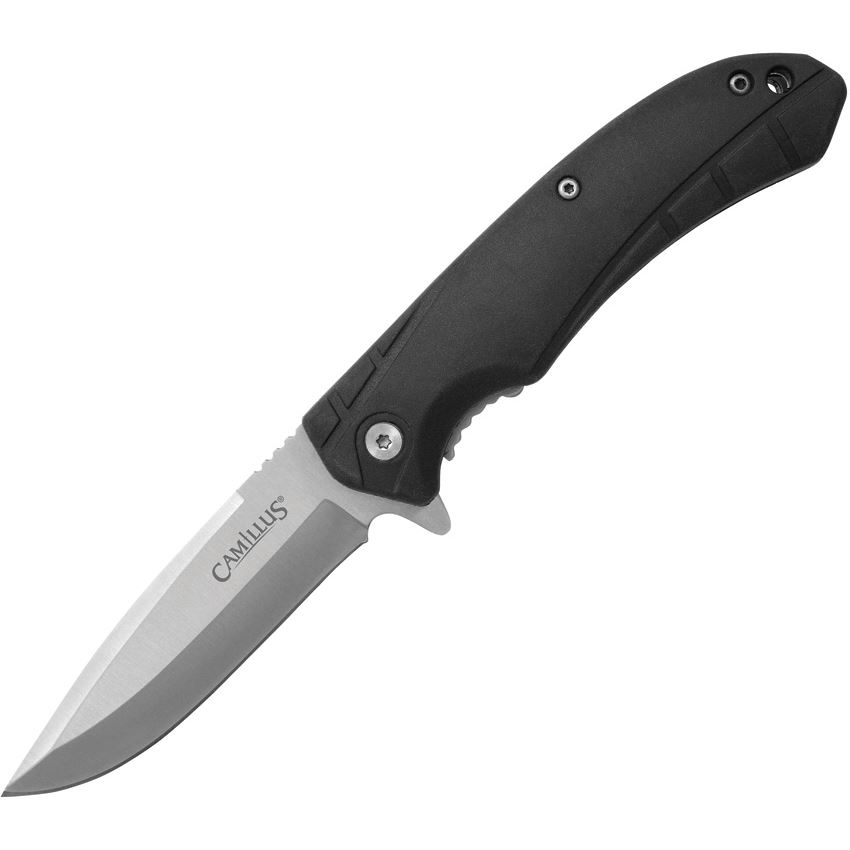 Model/Item/Part Number -CM19335. Camillus Knives - Griddy Assist Open Drop Point Linerlock Knife Black Handles. Assisted opening. 4.25" (10.8cm) closed. 3.25" (8.26cm) satin finish 420 stainless drop point blade. Black rubberized TPR handle. Extended tang. Lanyard hole. Pocket clip. Clam packed. Made in China.