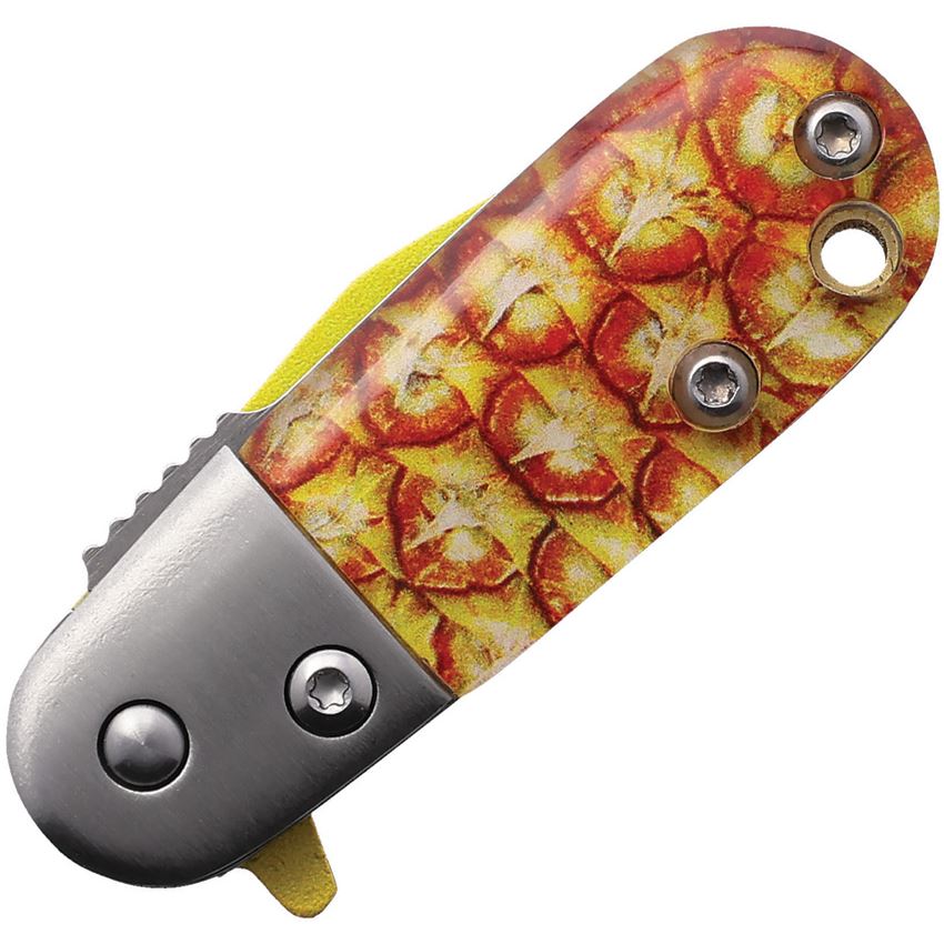 Model/Item/Part Number -RR2723. Rough Rider Knives - Assist Open Clip Point Linerlock Knife Handles. Assisted opening. 2" (5.08cm) closed. 1.38" (3.51cm) yellow coated stainless clip point blade. Acrylic handle. Stainless bolster(s). Extended tang. Lanyard hole. Pineapple handle artwork. Boxed. Made in China.