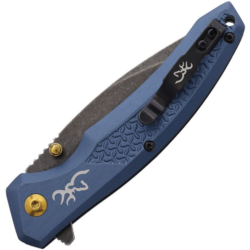 Model/Item/Part Number -BR0572B. Browning Knives - Black Stonewash Linerlock Knife Blue Aluminum Handles. 4.5" (11.43cm) closed. 3.5" (8.89cm) black stonewash finish 7Cr17MoV stainless blade. Blue textured aluminum handle. Extended tang. Thumb stud. Lanyard hole. Pocket clip. Boxed. Made in China.