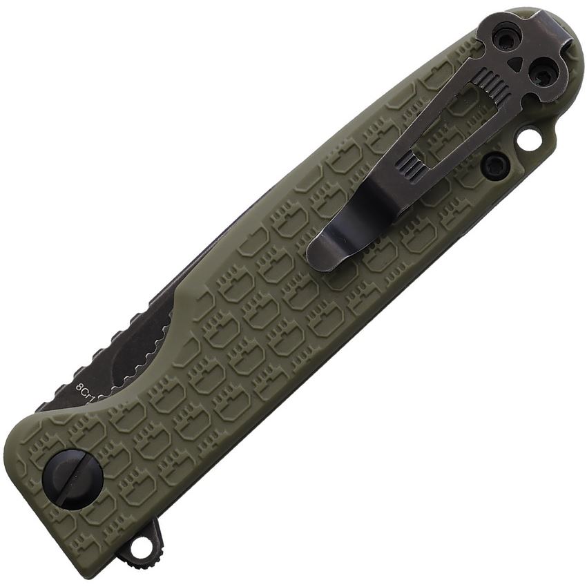 Model/Item/Part Number -DGRDPMOLBW. Daggerr Knives - Dopey Black Stonewash Drop Point Linerlock Knife OD Green FRN Handles. 3.88" (9.86cm) closed. 2.88" (7.32cm) black stonewash finish 8Cr13MoV stainless drop point blade. OD green textured FRN handle. Extended tang. Lanyard hole. Pocket clip. Boxed. Made in China.