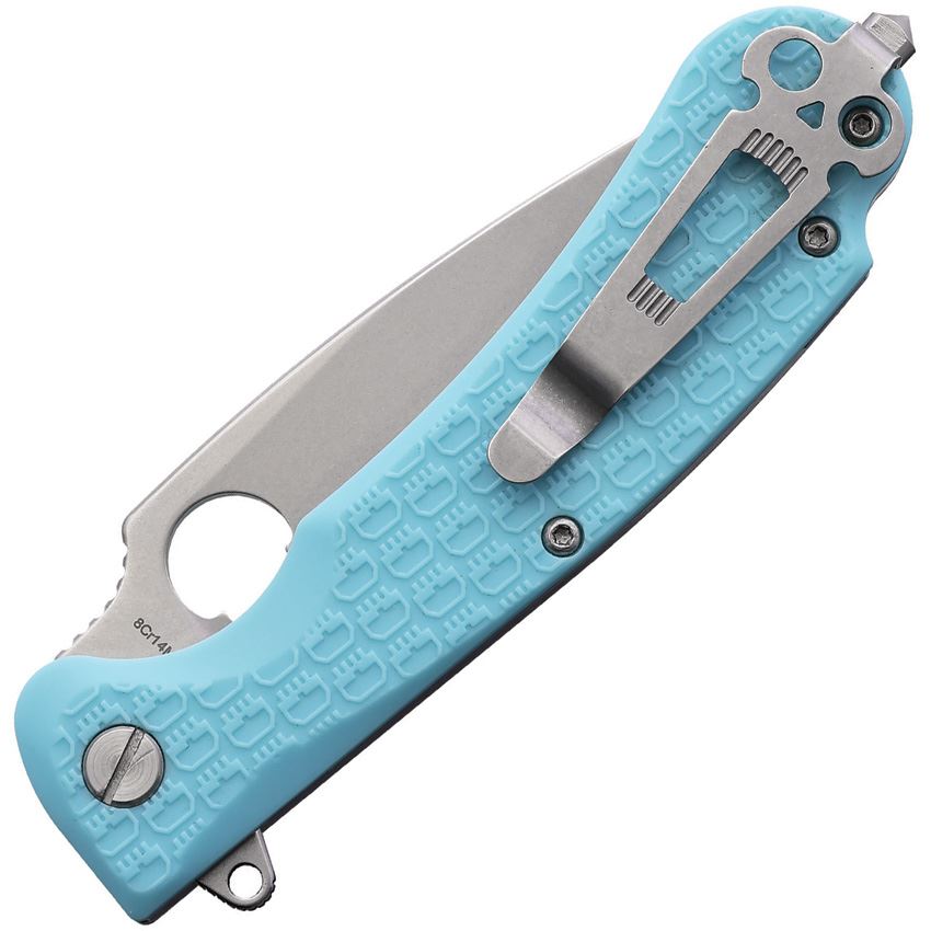 Model/Item/Part Number -DGRRSTFSW. Daggerr Knives - Resident Stonewash Spear Point Linerlock Knife Light Blue FRN Handles . 4.75" (12.07cm) closed. 3.5" (8.89cm) stonewash finish 8Cr14MoV stainless spear point blade. Light blue textured FRN handle. Extended tang. Glass breaker. Pocket clip. Thumb pull. Boxed. Made in China.