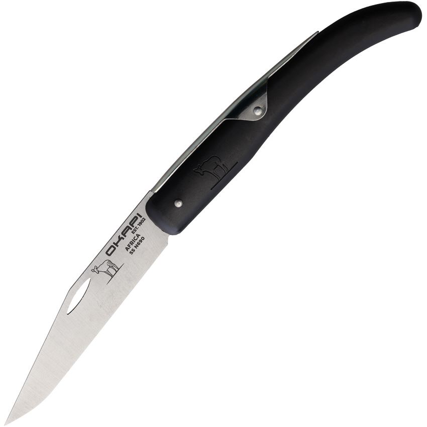 Model/Item/Part Number -KO02577. Okapi Knives - Folder Knife Black GFN Satin N690 Clip Point Knife Black Handles. 5.5" (13.97cm) closed. 4.13" (10.49cm) satin finish Bohler N690 stainless clip point blade. Black GFN handle. Boxed. Made in South Africa.