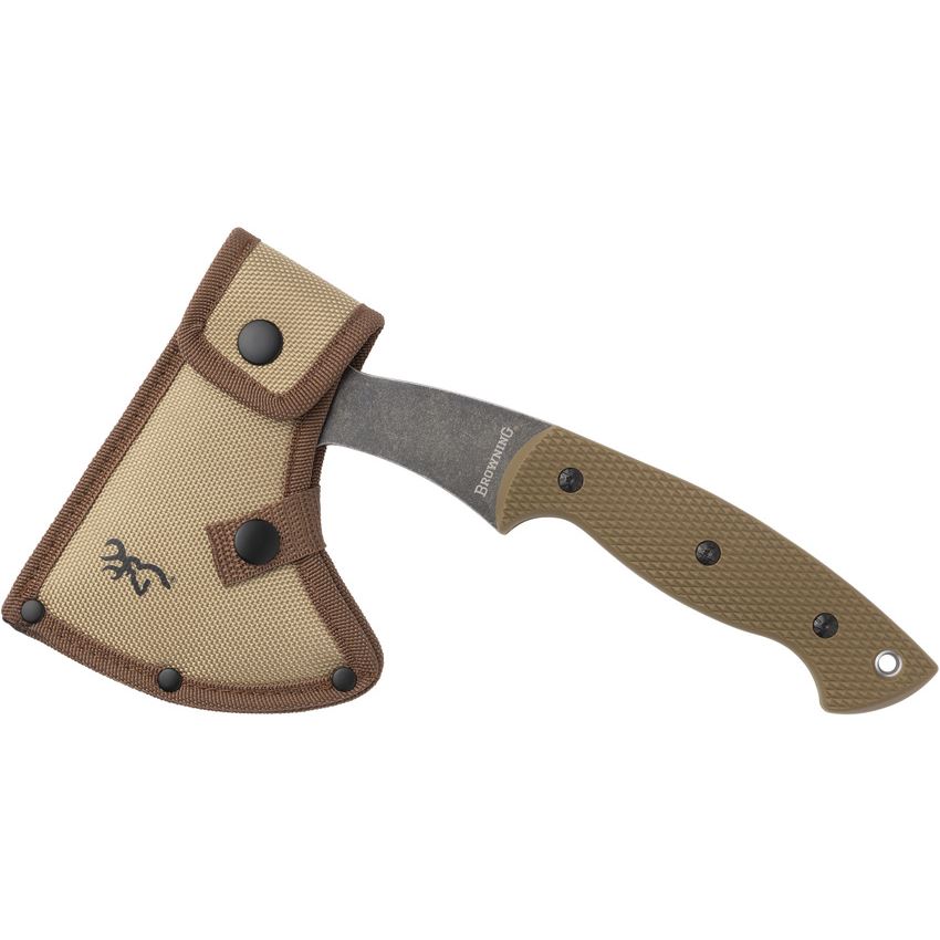 Model/Item/Part Number -BR0565. Browning Knives - Big Creek Black Hatchet. 10.75" overall. 4.75" black oxide coated 3Cr13MoV stainless axe head with 3.75" cutting edge. Full tang. Lanyard hole. Tan nylon belt sheath. Clam packed. Made in China.
