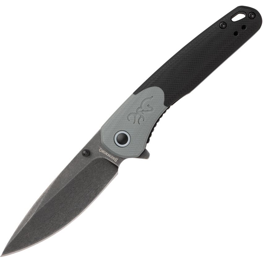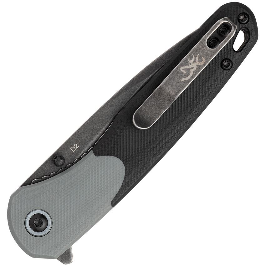 Model/Item/Part Number -BR0555B. Browning Knives - Cedar Black Stonewash D2 Carbon Steel Drop Point Linerlock Knife Black/Gray G10 Handles. 4.25" (10.8cm) closed. 3.25" (8.26cm) black stonewash finish D2 tool steel drop point blade. Black and gray G10 handle. Thumb stud. Extended tang. Lanyard hole. Pocket clip. Boxed. Made in China.