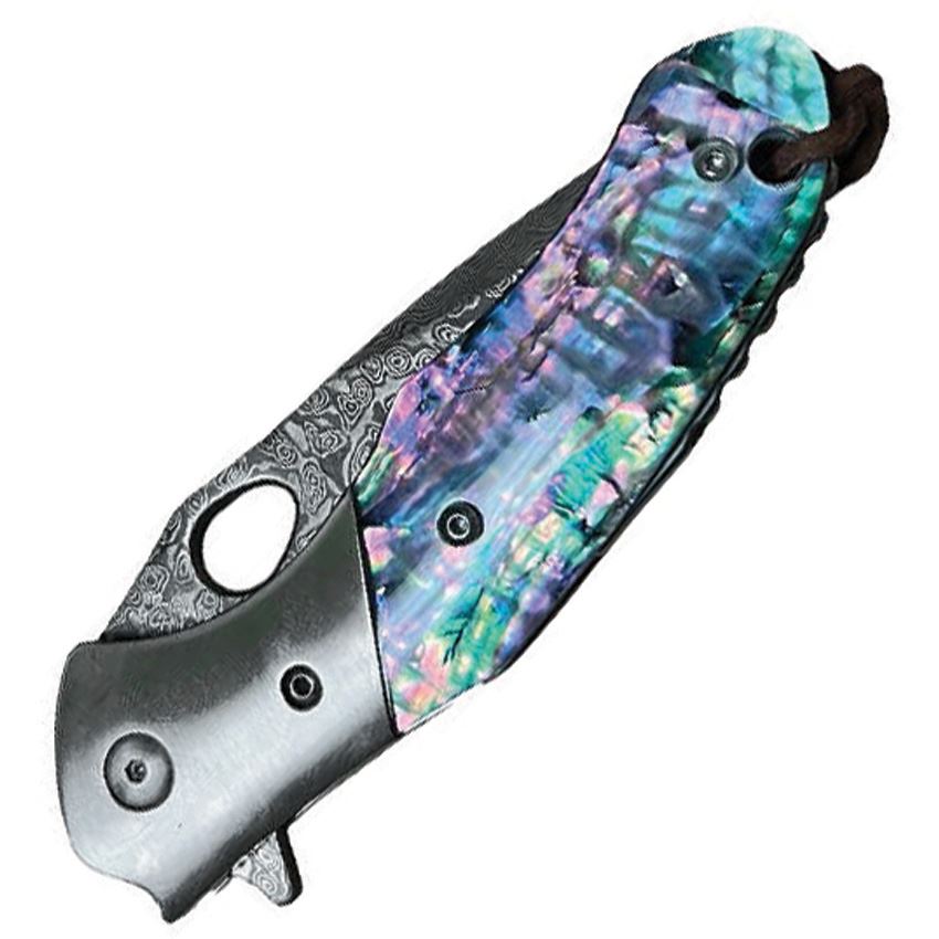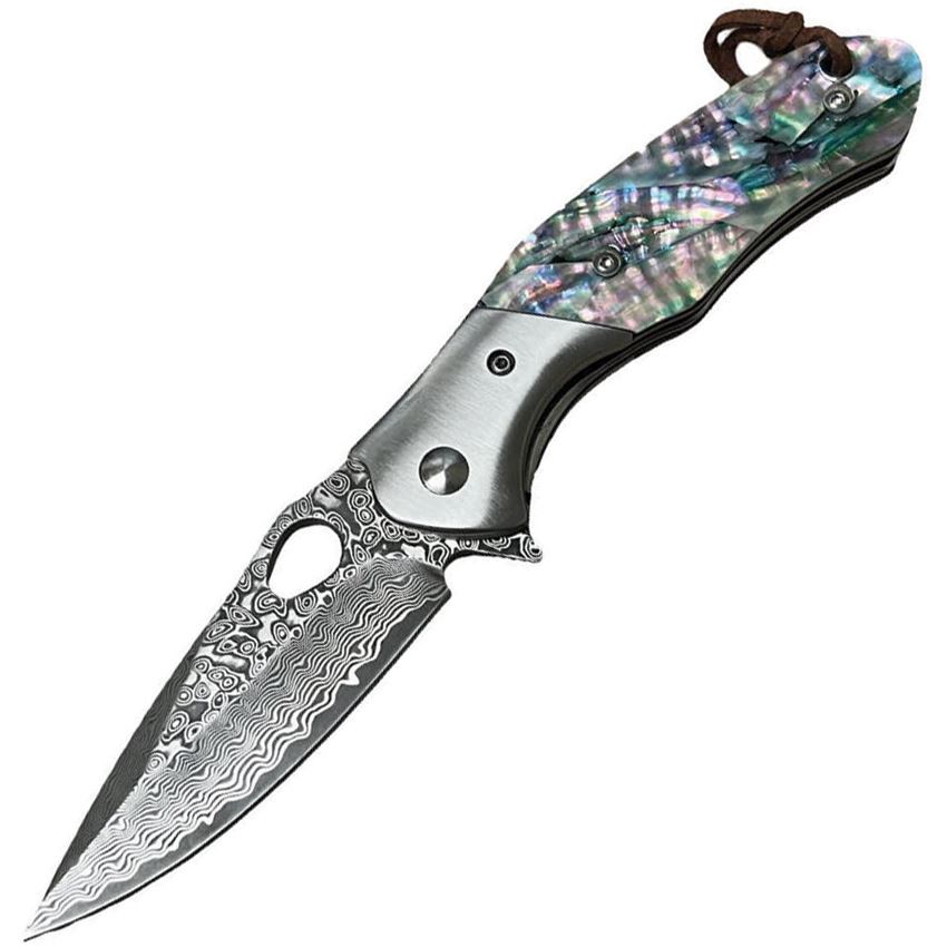 Model/Item/Part Number -EE10B009AB. ElitEdge - Large Damascus Drop Point Linerlock Knife Abalone Handles. 4.25" (10.8cm) closed. 3" (7.62cm) Damascus steel drop point blade. Abalone handle. Stainless bolster(s). Extended tang. Lanyard hole. Thumb pull. Pocket clip. Brown leather belt sheath. Boxed. Made in China.