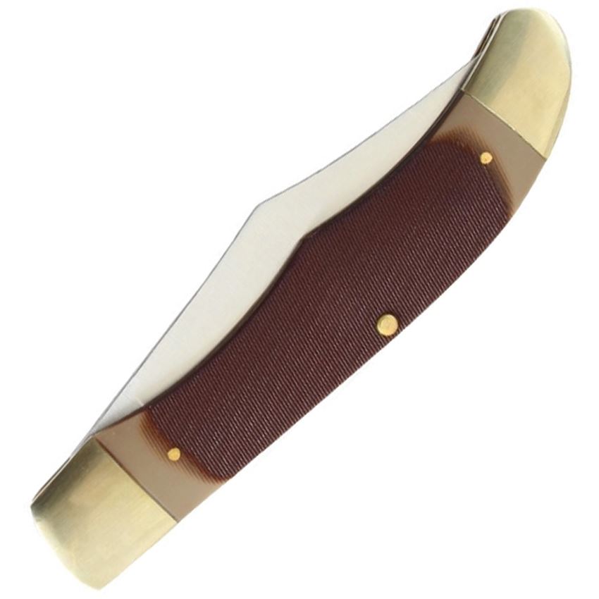 Model/Item/Part Number -ER2013. Elk Ridge Knives - Trapper Knife Sawcut Delrin Handles. 5.25" (13.34cm) closed. Satin finish 3Cr13MoV stainless clip and skinner blades. Sawcut Delrin handle. Brass bolster(s). Inlay shield. Brown leather belt sheath. Boxed. Made in China.