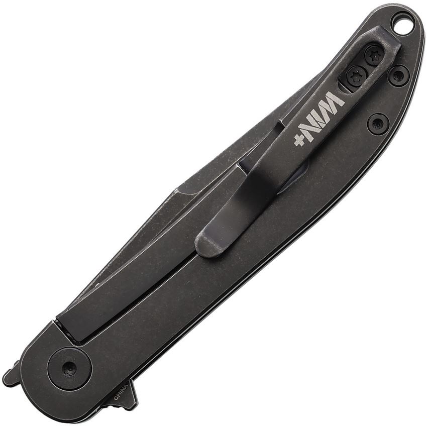 Model/Item/Part Number -WPK4366B. WIN+ Knives - Blackwash D2 Drop Point Framelock Knife Blackwash Titanium Handles. 4" (10.16cm) closed. 3" (7.62cm) black stonewash finish D2 tool steel drop point blade. Black stonewash finish titanium handle. Extended tang. Lanyard hole. Pocket clip. Black nylon zippered storage case. Boxed. Made in China.