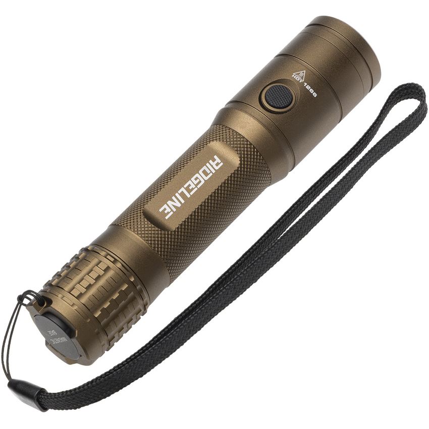 Model/Item/Part Number -BR1266. Browning Knives - Ridgeline Flashlight AAA. 5.88" overall. Lanyard. Water resistant. Impact resistant. Tailcap switch. Modes: White-Spot high (500 lumens, 1h 30m runtime); Spot low (56 lumens, 24h runtime); White-Wide angle (112 lumens, 6h runtime); Green-wide angle (26 lumens, 15h runtime). 183m beam distance. Mode selector with long distance spot beam. Last light memory. Magnetic base. Requires (3) AAA batteries (included). Aluminum construction. Color: Tan. Clam packed. Made in China.