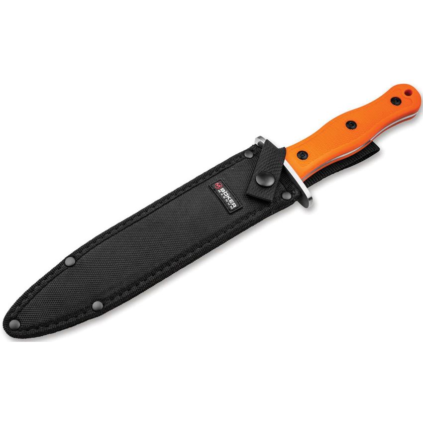 Model/Item/Part Number -BOM02RY807. Boker Tree Brand Knives - HL Boar Dagger Orange Handles. 14.5" (36.83cm) overall. 9" (22.86cm) satin finish 440 stainless dagger blade. Orange TPR handle. Full tang. Lanyard hole. Black nylon belt sheath. Boxed with hanging tab. Made in China.