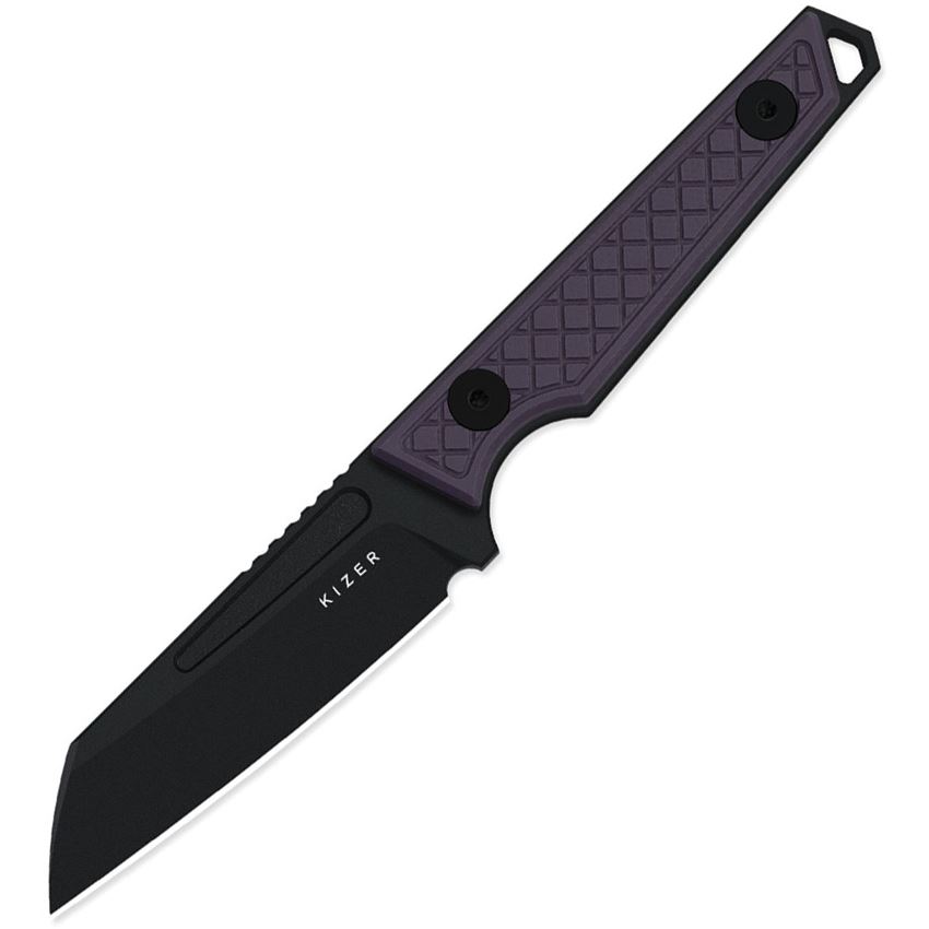 Model/Item/Part Number -KI1079A1. Kizer Cutlery & Knives - Phasmids Black AEB-L Sheepsfoot Fixed Blade Knife Purple G10 Handles. 6.13" (15.57cm) overall. 2.88" (7.32cm) black coated AEB-L stainless sheepsfoot blade. Purple G10 handle. Full, extended tang. Lanyard hole. Black Kydex belt sheath. Boxed. Made in China.