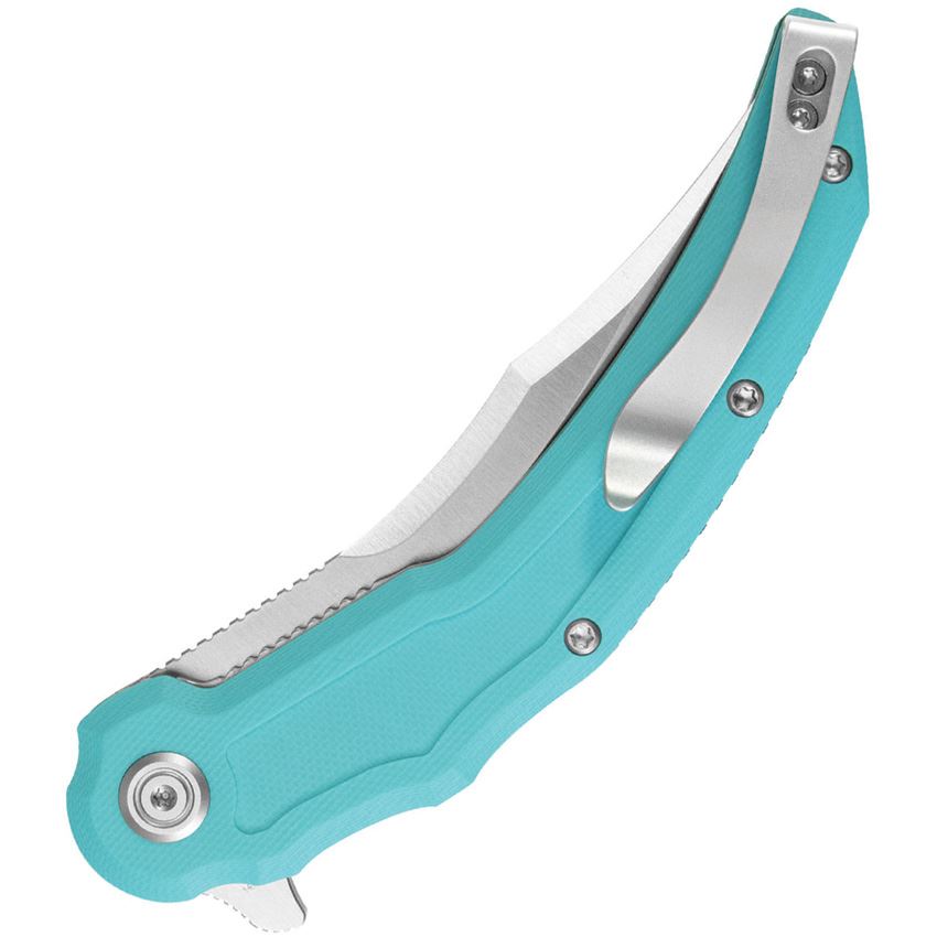 Model/Item/Part Number -KUB346B. Kubey Knives - Wave Crest Satin 14C28N Linerlock Knife Tiffany Blue G10 Handles. 4.88" (12.4cm) closed. 3.75" (9.53cm) satin finish 14C28N Sandvik stainless blade. Tiffany blue G10 handle. Extended tang. Pocket clip. Lanyard hole. Pikal style blade. Boxed. Made in China.