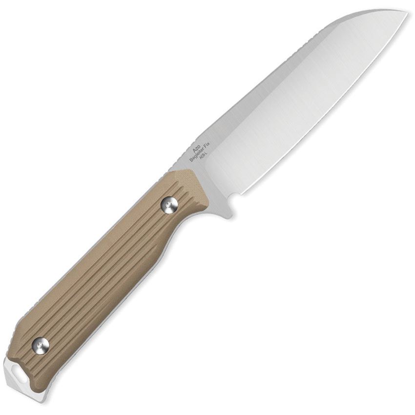 Model/Item/Part Number -KI1045MS2. Kizer Cutlery & Knives - Begleiter Satin AEB-L Sheepsfoot Fixed Blade Knife Tan G10 Handles. 7.88" (20.02cm) overall. 3.75" (9.53cm) satin finish AEB-L stainless sheepsfoot blade. Tan G10 handle. Full, extended tang. Glass breaker. Lanyard hole. Black Kydex belt sheath. Boxed. Made in China.