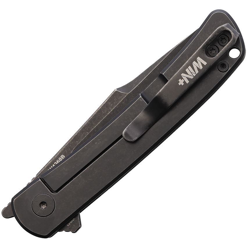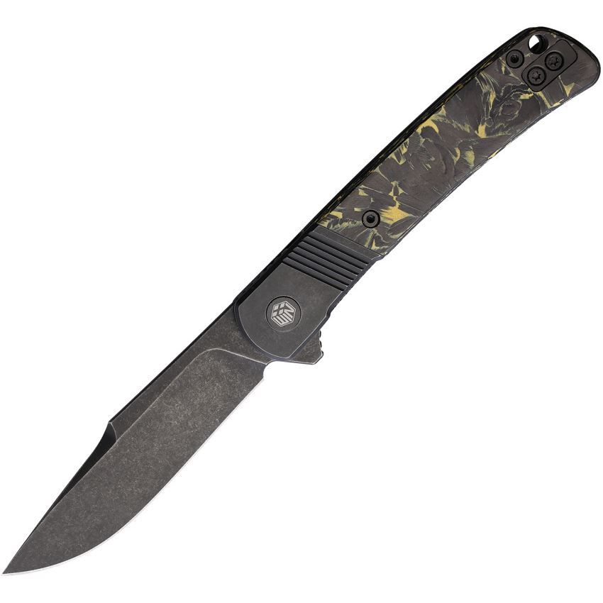 Model/Item/Part Number -WPK4368B. WIN+ Knives - Blackwash D2 Drop Point Framelock Knife Blackwash Carbon Fiber Handles. 4" (10.16cm) closed. 3" (7.62cm) black stonewash finish D2 tool steel drop point blade. Black stonewash finish titanium handle with carbon fiber inlay. Extended tang. Lanyard hole. Pocket clip. Black nylon zippered storage case. Boxed. Made in China.