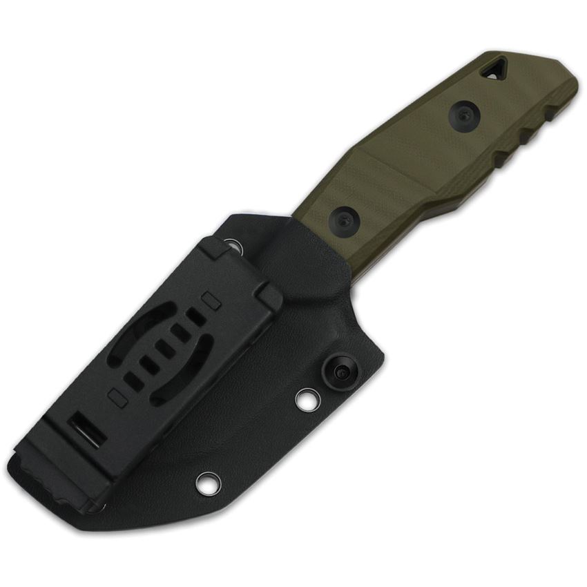 Model/Item/Part Number -KI1086A1. Kizer Cutlery & Knives - Quartz Blackwash AEB-L Tanto Fixed Blade Knife Od Green G10 Handles. 7.25" (18.42cm) overall. 3.13" (7.95cm) black stonewash finish AEB-L stainless tanto blade. OD green G10 handle. Full tang. Black Kydex belt sheath. Boxed. Made in China.