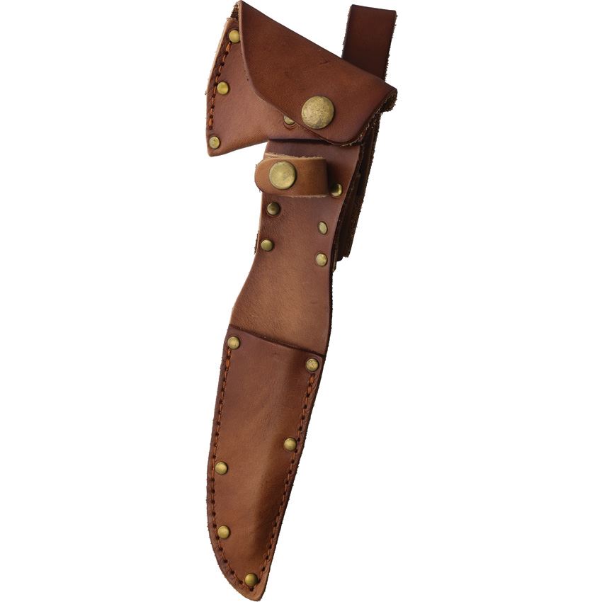 Model/Item/Part Number -MR729. Marbles Outdoors Knives - Hunter Hatchet Combo. 9" overall. 3.5" D2 tool steel axe head with 2" cutting edge. Black micarta handle. Hammer end. Includes 8" overall fixed blade with 4" skinner blade. Brass guard and pommel. Brown leather belt sheath. Boxed. Made in China.