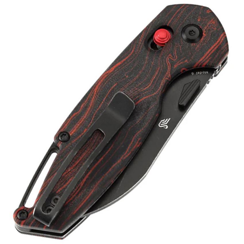 Model/Item/Part Number -T1022V7. Templar Knives - Model 6 Crossbar Lock Knife Blk/Red Blackwash 14C28N Sheepsfoot Knife G10 Handles. 4.13" (10.49cm) closed. 3.13" (7.95cm) BlackWash finish 14C28N Sandvik stainless sheepsfoot blade. Black and red G10 G-Mascus handle. Thumb disk. Lanyard hole. Pocket clip. Boxed. Made in China.