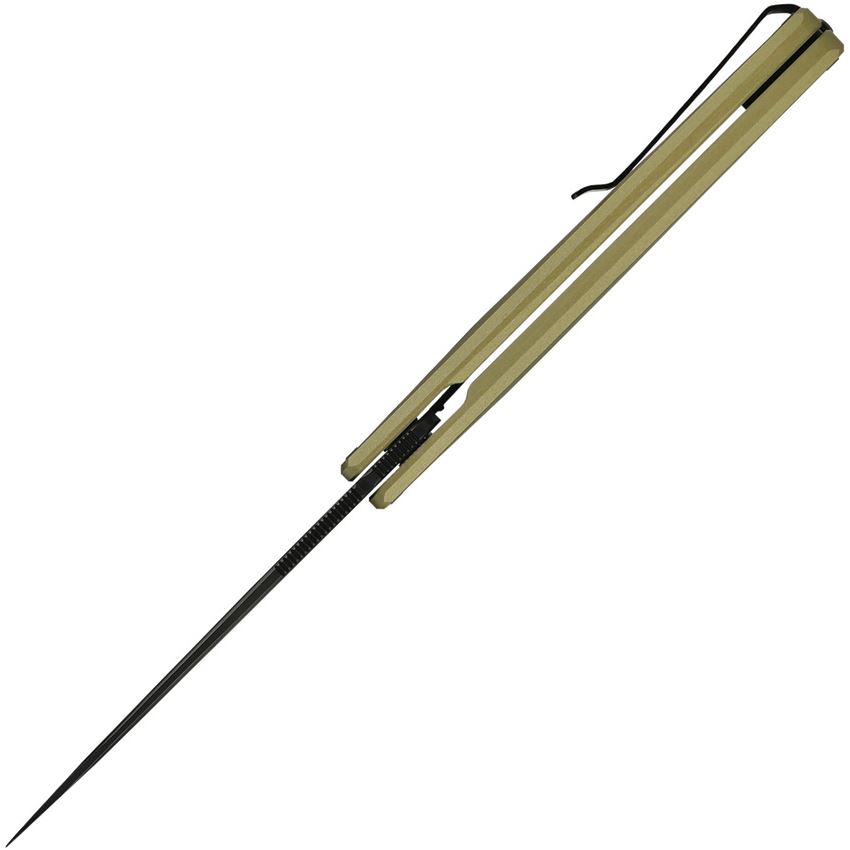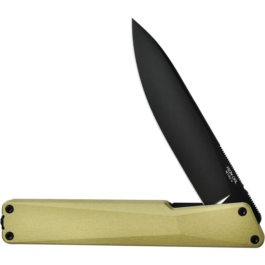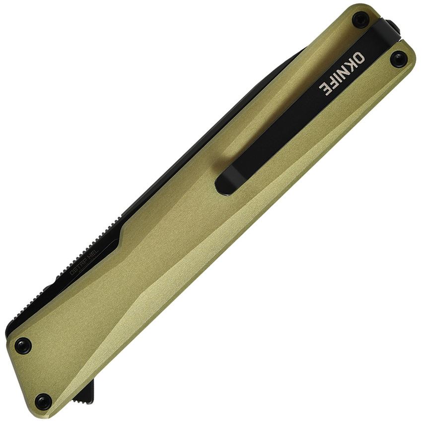 Model/Item/Part Number -OKNAIONOG. Oknife - AION Liner Lock Olive Green. 4.5" (11.43cm) closed. 3.5" (8.89cm) black PVD coated Nitro V steel drop point blade. Extended tang. Pocket clip. Matte gold finish OAL super aluminum handle. Designed by Ostap Hel. Boxed. Made in China.