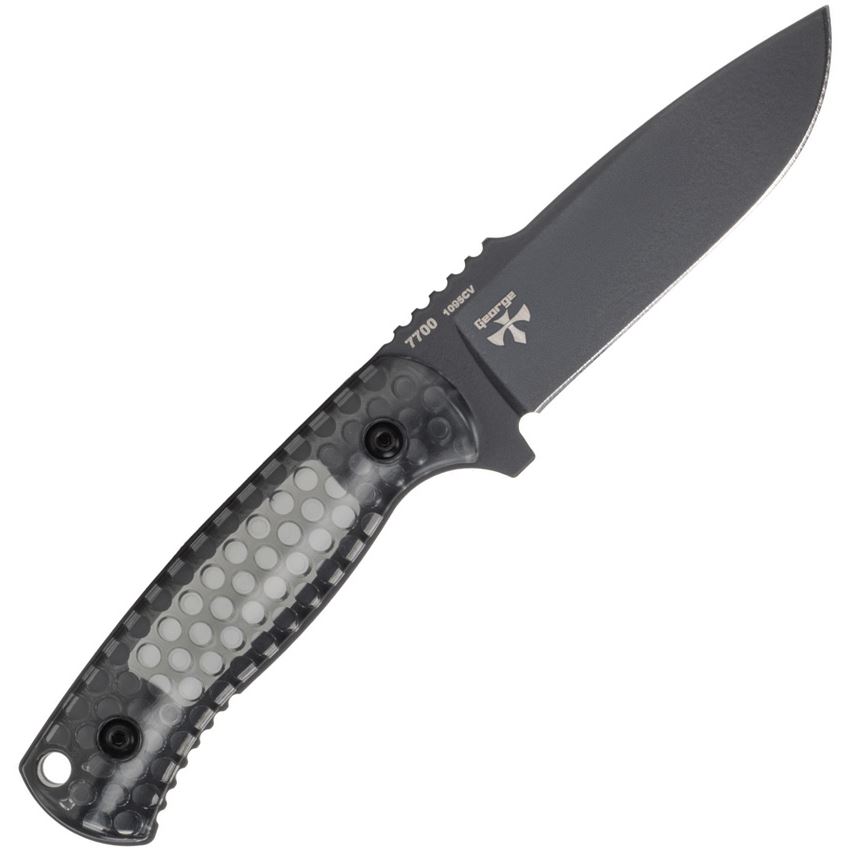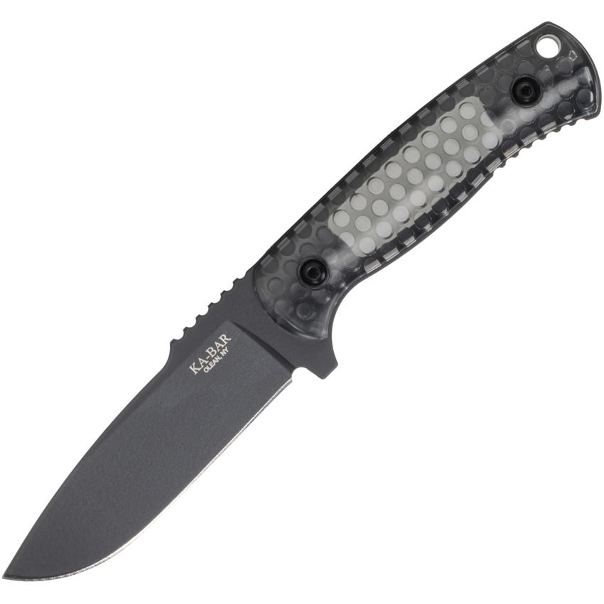 Model/Item/Part Number -KA7700. Ka-Bar Knives - George Cool Name Black Carbon Steel Drop Point Fixed Blade Knife Smoked Handles. 9" (22.86cm) overall. 4.25" (10.8cm) black finish 1095 Cro-Van carbon steel drop point blade. Smoked translucent polycarbonate handle. Full tang. Lanyard hole. Black molded plastic belt sheath. Designed by Les George. Boxed. Proudly made in the USA.