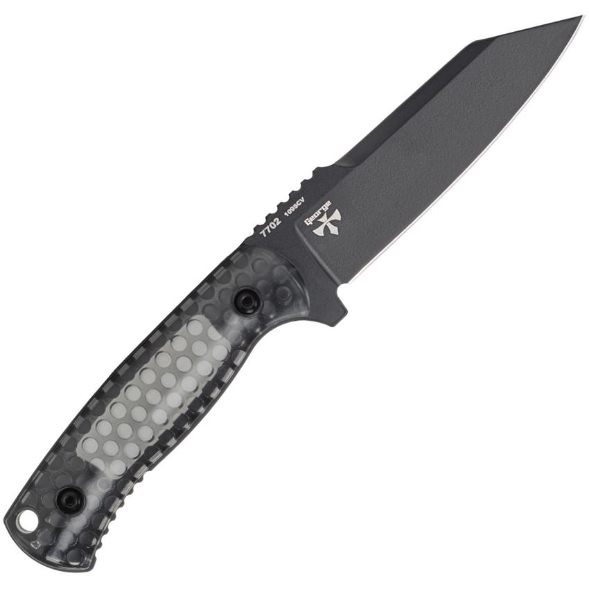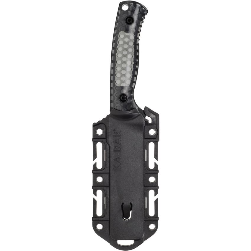 Model/Item/Part Number -KA7702. Ka-Bar Knives - George Cool Name Black Carbon Steel Reverse Tanto Fixed Blade Knife Smoked Handles. 9" (22.86cm) overall. 4.25" (10.8cm) black finish 1095 Cro-Van carbon steel reverse tanto blade. Smoked translucent polycarbonate handle. Full tang. Lanyard hole. Black molded plastic belt sheath. Boxed. Proudly made in the USA.