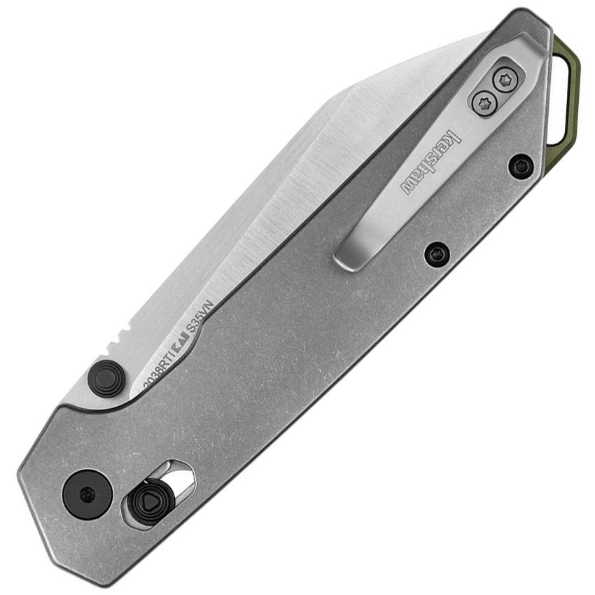 Model/Item/Part Number -KS2038RTI. Kershaw Knives - Iridium Stonewash M390 Reverse Tanto DuraLock Knife Titanium Handles. 4.5" (11.43cm) closed. 3.5" (8.89cm) satin finish Bohler M390 stainless reverse tanto blade. Stonewash finish titanium handle. Thumb stud. Lanyard hole. Pocket clip. Boxed. Made in China.