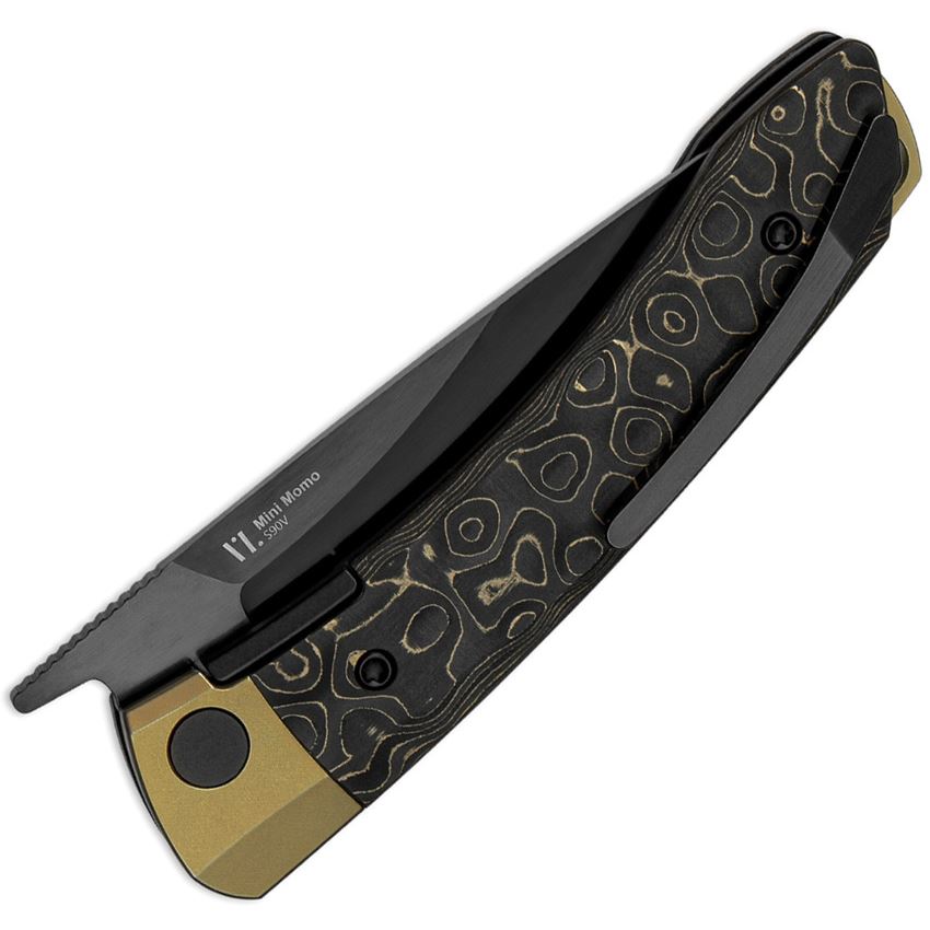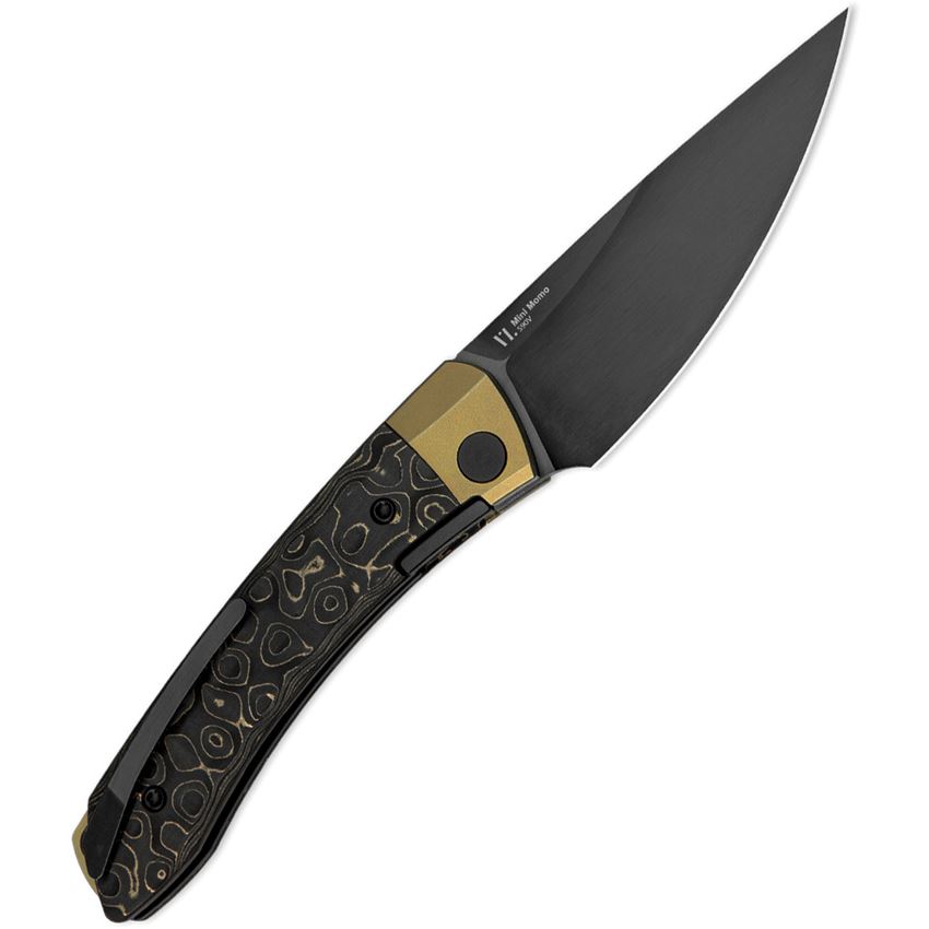 Model/Item/Part Number -KI3663A3. Kizer Cutlery & Knives - Mini MoMo Black DLC S90V Drop Point Linerlock Knife Gold Dark Matter Carbon Fiber Handles. 4.13" (10.49cm) closed. 3.25" (8.26cm) black DLC coated S90V steel drop point blade. Gold Dark Matter carbon fiber handle. Extended tang. Boxed. Made in China.