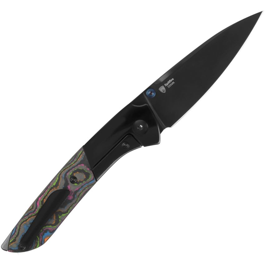 Model/Item/Part Number -KI3690A2. Kizer Cutlery & Knives - Spitfire Black DLC S35VN Drop Point Framelock Knife Black Carbon Fiber Handles. 4.38" (11.13cm) closed. 3.13" (7.95cm) black DLC coated S35VN stainless drop point blade. Black titanium handle with 80's Camo carbon fiber inlay. Thumb stud. Pocket clip. Boxed. Made in China.