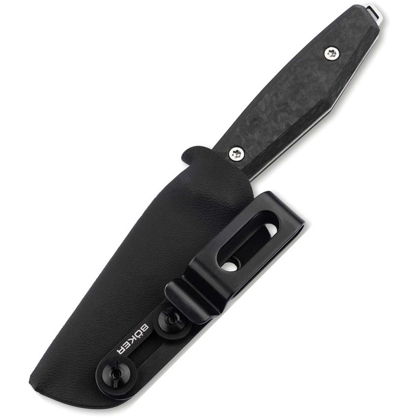 Model/Item/Part Number -BO124501. Boker Tree Brand Knives - AK1 Satin MagnaCut Fixed Blade Knife Carbon Fiber Handles. 6.88" (17.48cm) overall. 3.13" (7.95cm) satin finish MagnaCut steel reverse tanto blade. Carbon fiber handle. Full, extended tang. Lanyard hole. Black Kydex belt sheath. Boxed. Made in Germany.