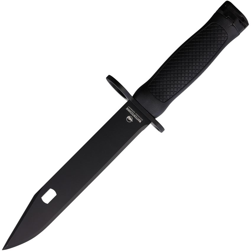Model/Item/Part Number -WKB3K. Waffentechnik Knives - B3K Combat Knife. 12.13" (30.81cm) overall. 7" (17.78cm) black matte finish stainless bowie blade. Black textured plastic handle. Stainless guard and pommel. Black nylon belt sheath. Bagged. Made in Germany.