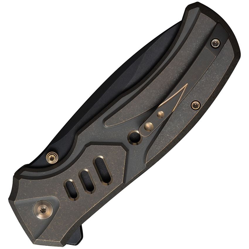 Model/Item/Part Number -WE240943. WE Knife Company - Zentron Blackwash M390 Tanto Button Lock Knife Stonewash Bronze Titanium Handles. 4.63" (11.76cm) closed. 3.5" (8.89cm) black stonewash finish Bohler M390 stainless tanto blade. Bronze stonewash finish titanium handle. Thumb stud. Extended tang. Pocket clip. Black nylon zippered storage case. Boxed. Made in China.