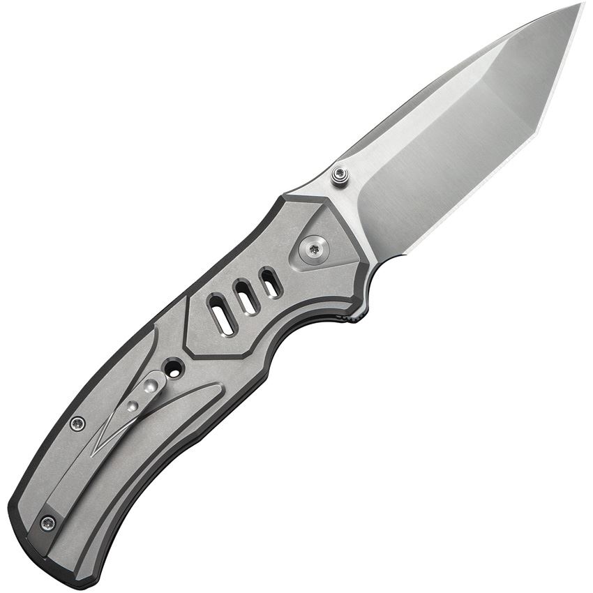 Model/Item/Part Number -WE240942. WE Knife Company - Zentron Satin M390 Tanto Button Lock Knife Gray Titanium Handles. 4.63" (11.76cm) closed. 3.5" (8.89cm) satin finish Bohler M390 stainless tanto blade. Gray titanium handle. Thumb stud. Extended tang. Pocket clip. Black nylon zippered storage case. Boxed. Made in China.