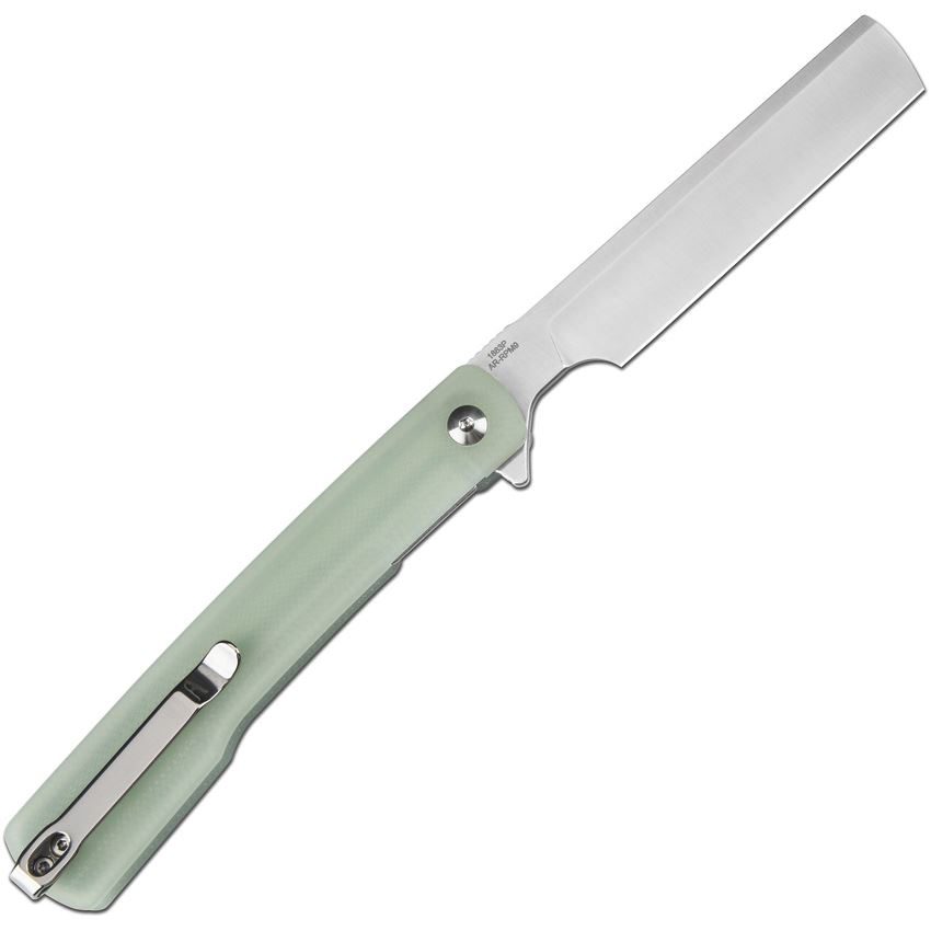 Model/Item/Part Number - ATZ1883PNTG. Artisan Knives - Orthodox Satin Linerlock Knife Jade G10 Handles. 4.5" (11.43cm) closed. 3.5" (8.89cm) satin finish AR-RPM9 stainless blade. Jade G10 handle. Extended tang. Pocket clip. Razor blade. Boxed. Made in China.