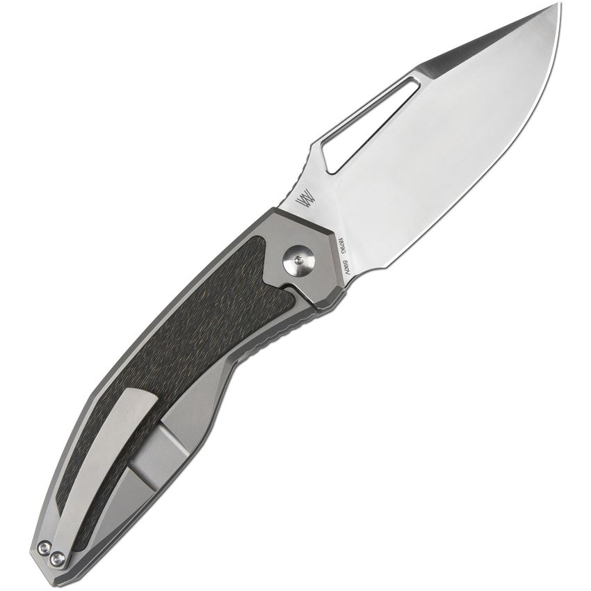 Model/Item/Part Number - ATZ1879GGY. Artisan Knives - Fragarach Black S90V Drop Point Framelock Knife Gray Titanium/Fat Carbon Fiber Handles. 4.88" (12.4cm) closed. 3.75" (9.53cm) satin finish S90V steel drop point blade. Gray titanium handle with Black Fat carbon fiber inlay. Thumb pull. Pocket clip. Black nylon zippered storage case. Boxed. Made in China.