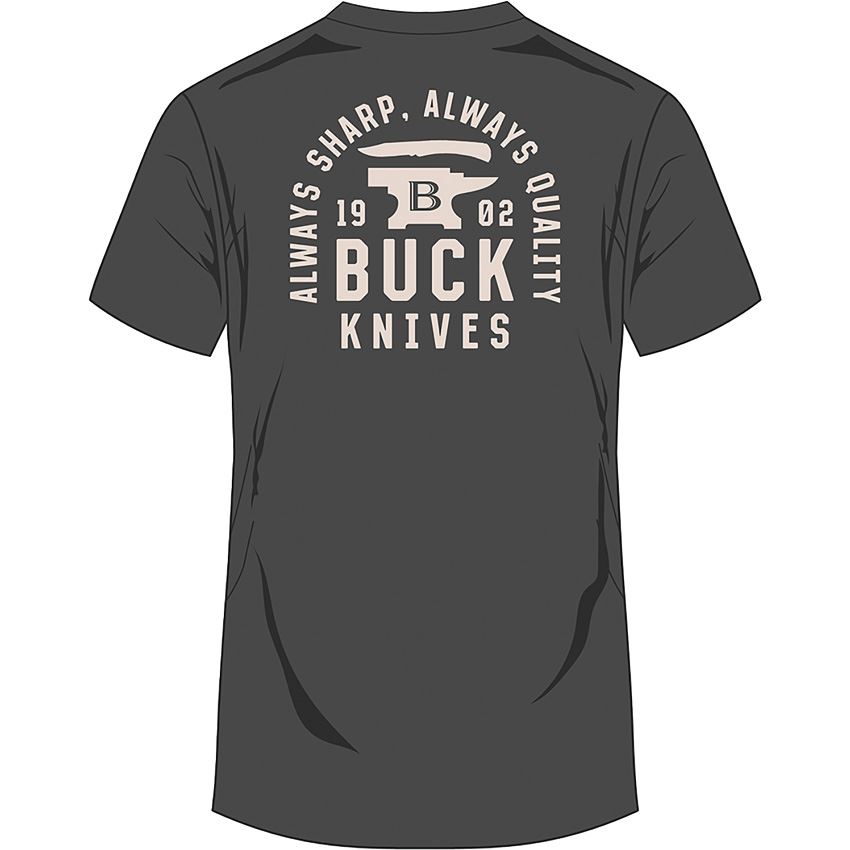 Model/Item/Part Number - BU14293. Buck Knives - Stacked Badge T-Shirt Gray XL. Buck stacked badge logo on back and front left. Color: Charcoal. Size: X-Large. Bulk packed. Made in Cambodia.