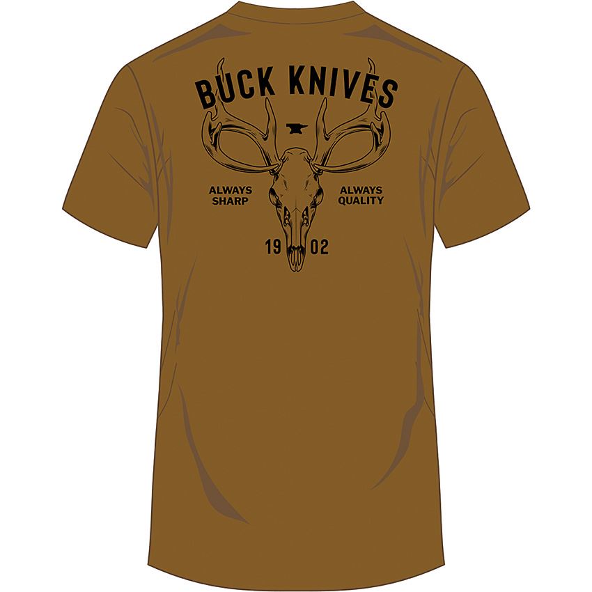 Model/Item/Part Number - BU14300. Buck Knives - Skull T-Shirt Coyote XL. Buck skull logo on back and front left. Color: Coyote Brown. Size: X-Large. Bulk packed. Made in Cambodia.