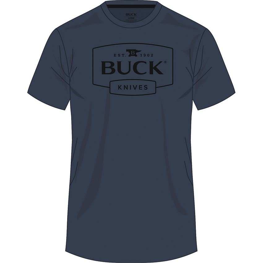 Model/Item/Part Number - BU14328. Buck Knives - Logo T-Shirt Navy XL. Buck classic logo on back and front left. Color: Navy. Size: X-Large. Bulk packed. Made in Cambodia.