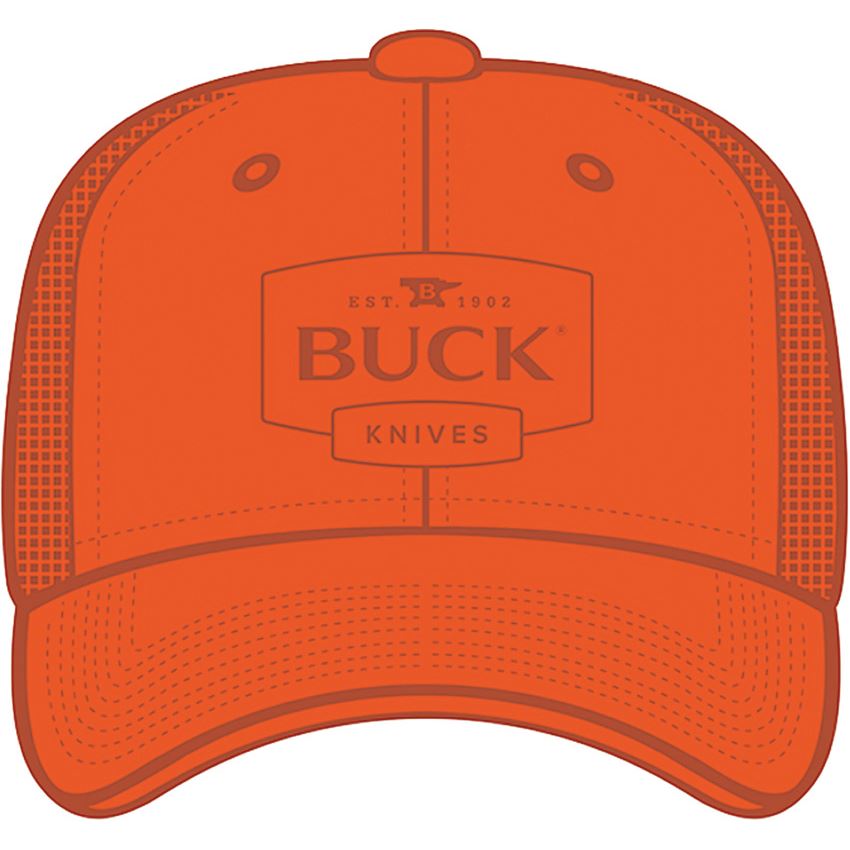 Model/Item/Part Number - BU14251. Buck Knives - Blaze Orange PVC Patch Hat. PVC patch with black Buck logo. Mesh back. Snap closure. Color: Blaze orange. Bulk packed. Made in Cambodia.
