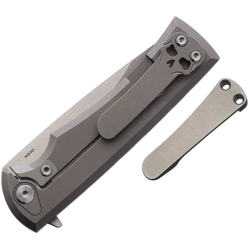 Model/Item/Part Number - CHAV43495. Chaves Knives - Liberation Street Satin M390 Drop Point Framelock Knife Stonewash Titanium Handles. 4.25" (10.8cm) closed. 3.5" (8.89cm) satin finish Bohler M390 stainless drop point blade. Stonewash finish titanium handle. Extended tang. Pocket clip. Boxed. Made in China.