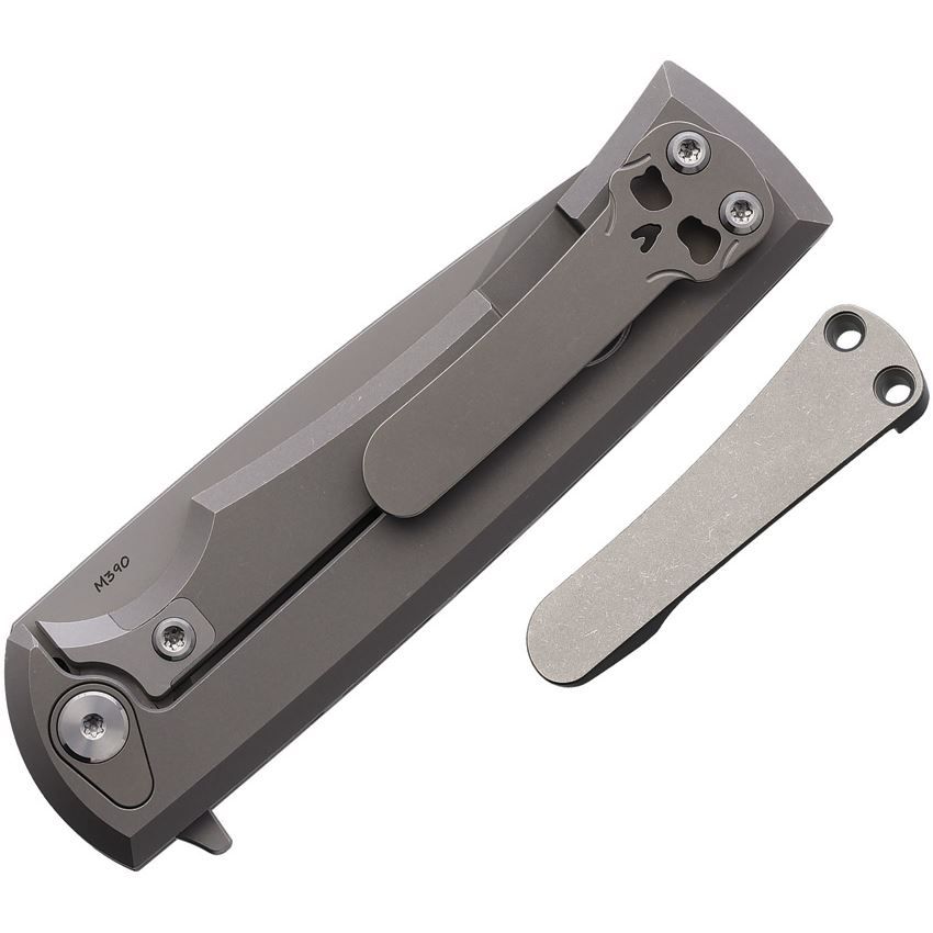 Model/Item/Part Number - CHAV43518. Chaves Knives - Liberation Street Stonewash M390 Drop Point Framelock Knife Stonewash Titanium Handles. 4.25" (10.8cm) closed. 3.5" (8.89cm) stonewash finish Bohler M390 stainless drop point blade. Stonewash finish titanium handle. Extended tang. Pocket clip. Boxed. Made in China.