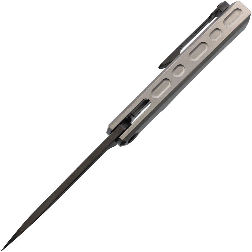 Model/Item/Part Number - CHAV43570. Chaves Knives - Liberation Street Black M390 Drop Point Framelock Knife Stonewash Titanium Handles. 4.25" (10.8cm) closed. 3.5" (8.89cm) black PVD coated Bohler M390 stainless drop point blade. Stonewash finish titanium handle. Extended tang. Pocket clip. Boxed. Made in China.