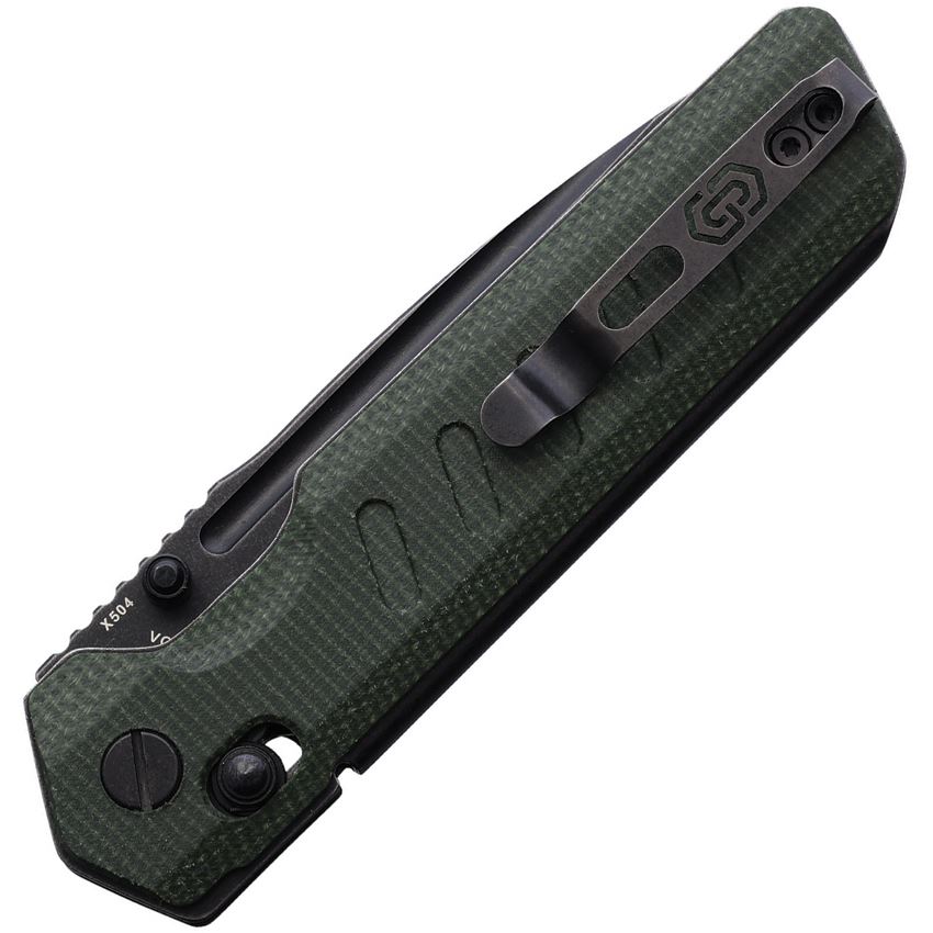 Model/Item/Part Number - CRSX504GNBF. Critical Strike Knives - X504 Black Stonewash VG-10 Drop Point Slide Lock Knife Green Micarta Handles. 4.38" (11.13cm) closed. 3.38" (8.59cm) black stonewash finish VG-10 stainless drop point blade. Green canvas micarta handle. Thumb stud. Pocket clip. Boxed. Made in China.