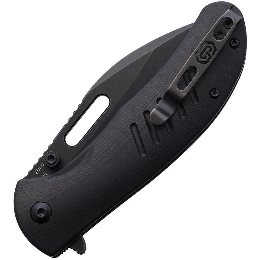 Model/Item/Part Number - CRSTL505BKBW. Critical Strike Knives - Zulu Blackwash VG-10 Drop Point Button Lock Knife Black G10 Handles. 4.5" (11.43cm) closed. 3.5" (8.89cm) black stonewash finish VG-10 stainless drop point blade. Black G10 handle. Thumb stud. Thumb pull. Extended tang. Pocket clip. Boxed. Made in China.