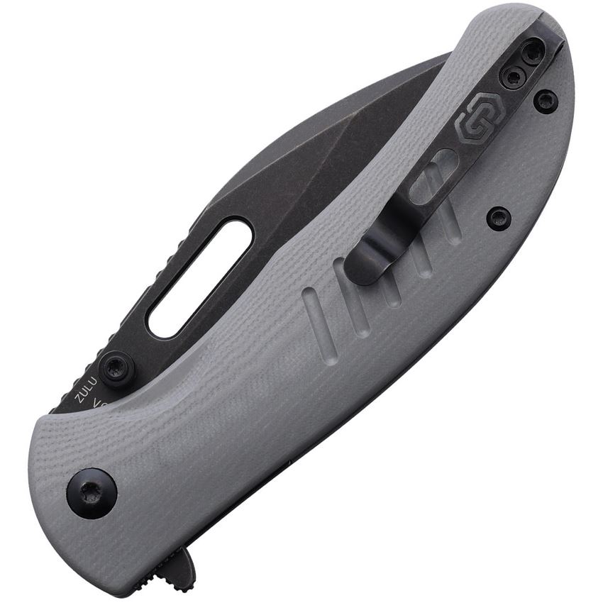 Model/Item/Part Number - CRSTL505GRBW. Critical Strike Knives - Zulu Blackwash VG-10 Drop Point Button Lock Knife Gray G10 Handles. 4.5" (11.43cm) closed. 3.5" (8.89cm) black stonewash finish VG-10 stainless drop point blade. Gray G10 handle. Thumb stud. Thumb pull. Extended tang. Pocket clip. Boxed. Made in China.