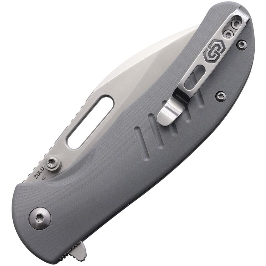 Model/Item/Part Number - CRSTL505GRSA. Critical Strike Knives - Zulu Satin VG-10 Drop Point Button Lock Knife Gray G10 Handles. 4.5" (11.43cm) closed. 3.5" (8.89cm) satin finish VG-10 stainless drop point blade. Gray G10 handle. Thumb stud. Thumb pull. Extended tang. Pocket clip. Boxed. Made in China.