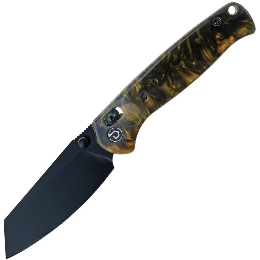 Model/Item/Part Number - TD024BKGD. Defcon Blade Works - Artifact Black 14C28N Sheepsfoot Axis Lock Knife Black/Gold Handles. 4" (10.16cm) closed. 3.25" (8.26cm) black finish 14C28N Sandvik stainless sheepsfoot blade. Thumb stud. Lanyard hole. Pocket clip. Black and gold marble epoxy resin handle. Boxed. Made in China.