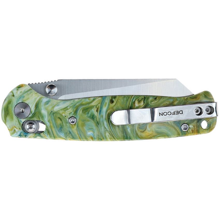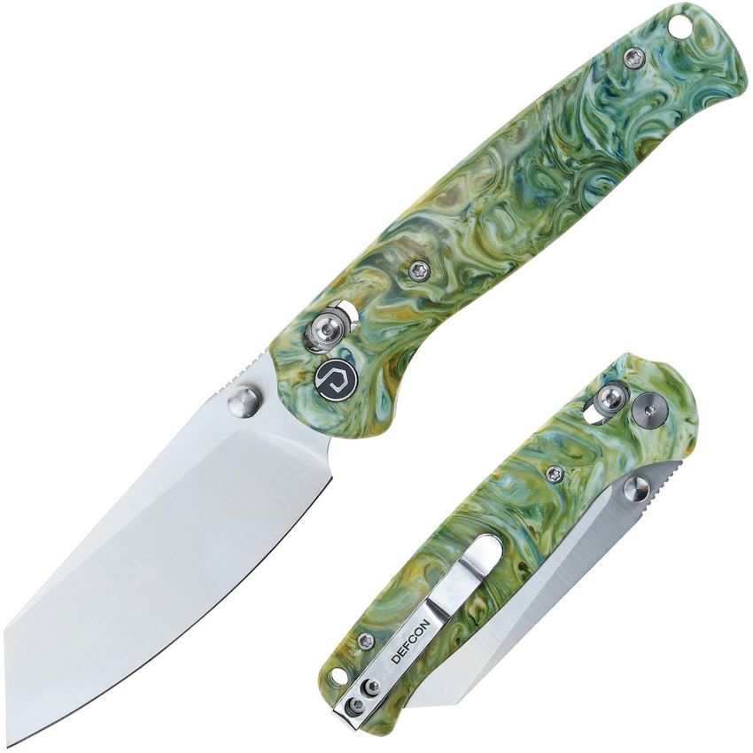 Model/Item/Part Number - TD024GNYL. Defcon Blade Works - Artifact Blushed Sheepsfoot Axis Lock Knife Green/Gold Resin Handles. 4" (10.16cm) closed. 3.25" (8.26cm) brushed finish 14C28N Sandvik stainless sheepsfoot blade. Thumb stud. Lanyard hole. Pocket clip. Green and gold marble epoxy resin handle. Boxed. Made in China.