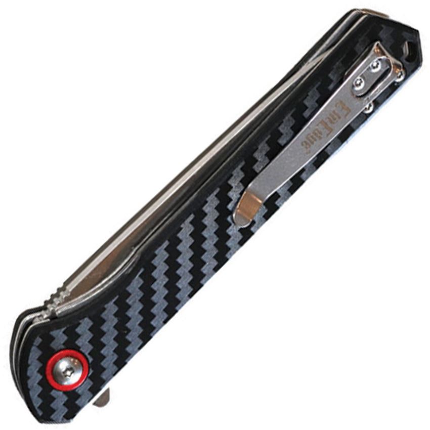 Model/Item/Part Number - EE10B016SL. ElitEdge - Satin 8Cr13MoV Spear Point Linerlock Knife Carbon Fiber Handes. 4.75" (12.07cm) closed. 3.75" (9.53cm) satin finish 8Cr13MoV stainless spear point blade. Carbon fiber handle. Extended tang. Lanyard hole. Pocket clip. Red accents. Boxed. Made in China.