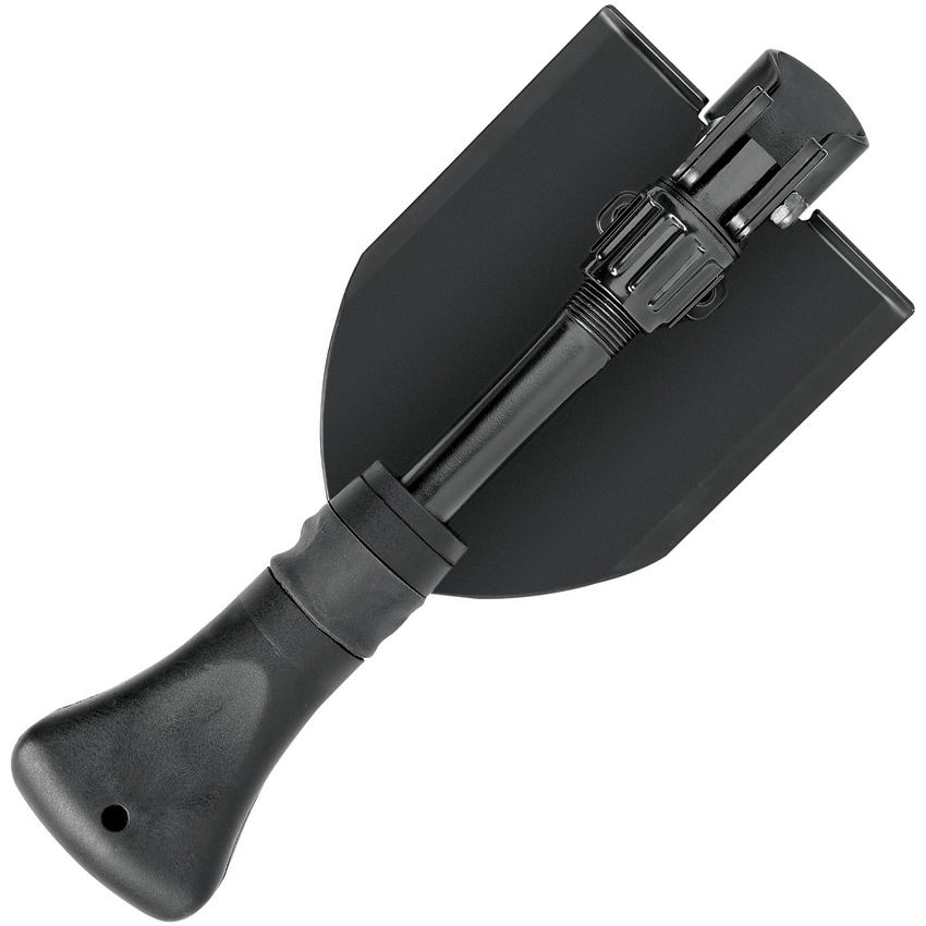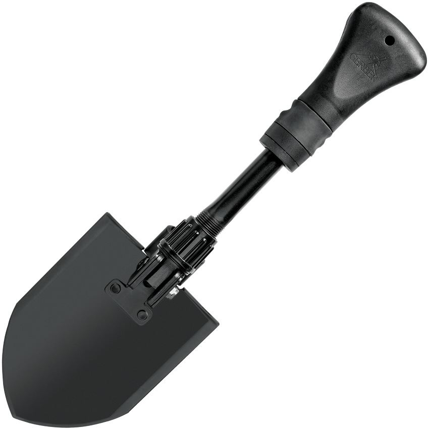 Model/Item/Part Number - G1072987. Gerber Knives - Gorge Folding Shovel. 15.75" overall. Black rubberized glass filled nylon handle. Lanyard hole. Carbon steel shovel head. Easy push button slide mechanism. Hammer mode for pounding in tent stakes. Nylon draw string bag. English and French language packaging. Boxed with hanging tab. Made in China.