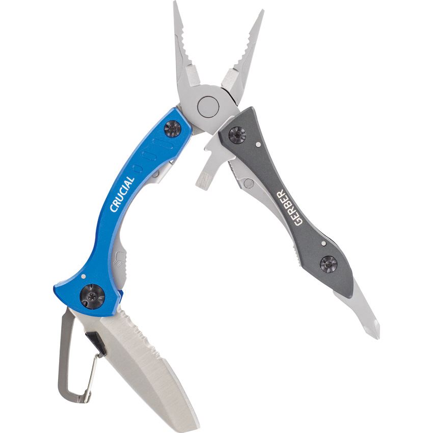 Model/Item/Part Number - G2951. Gerber Knives - Crucial Pocket Tool Blue/Gray Handles. 3.5" closed. 5.5" overall. Blue and gray aluminum handles. Tools include: Needlenose pliers l Pliers l Wire cutter l Pocket clip l Flat head screwdriver l Phillips screwdriver l Serrated blade l Bottle opener l Carabiner. Fully locking outboard components. Clam packed. Made in China.